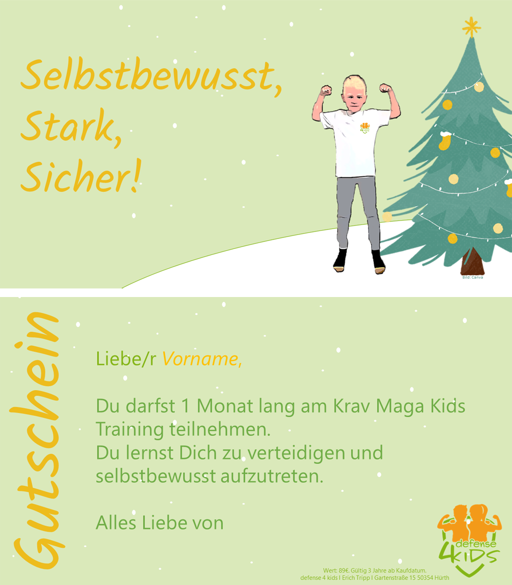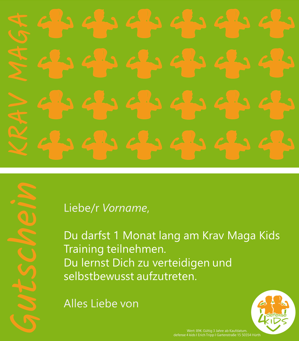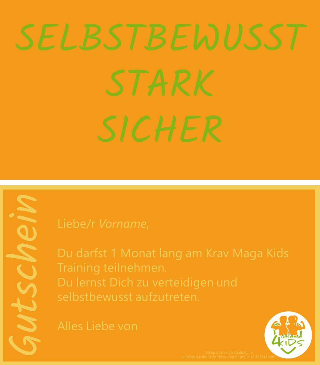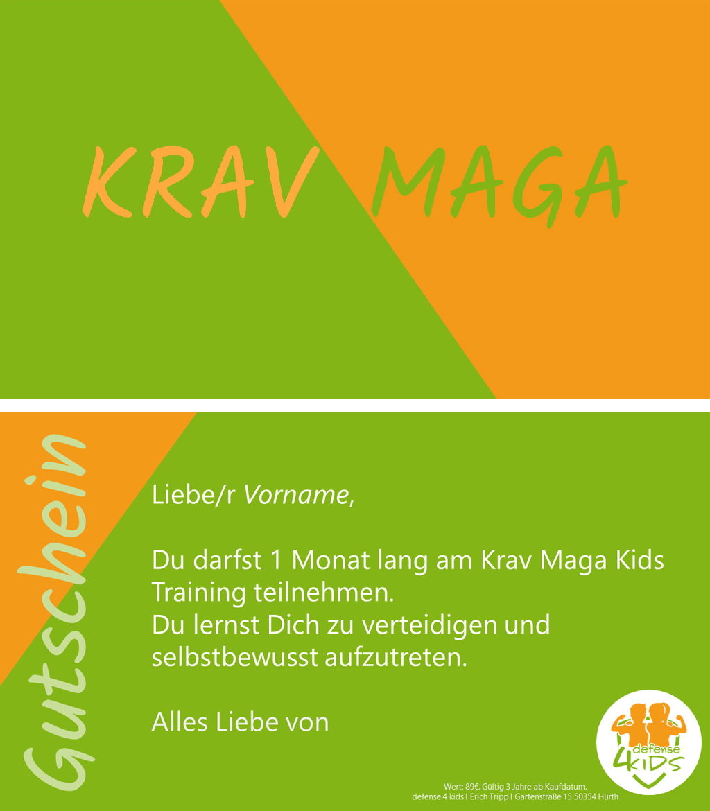 Dann verschenken Sie doch einen Gutschein für unser Krav Maga Kids Training oder unseren Selbstsicherheitskurs!